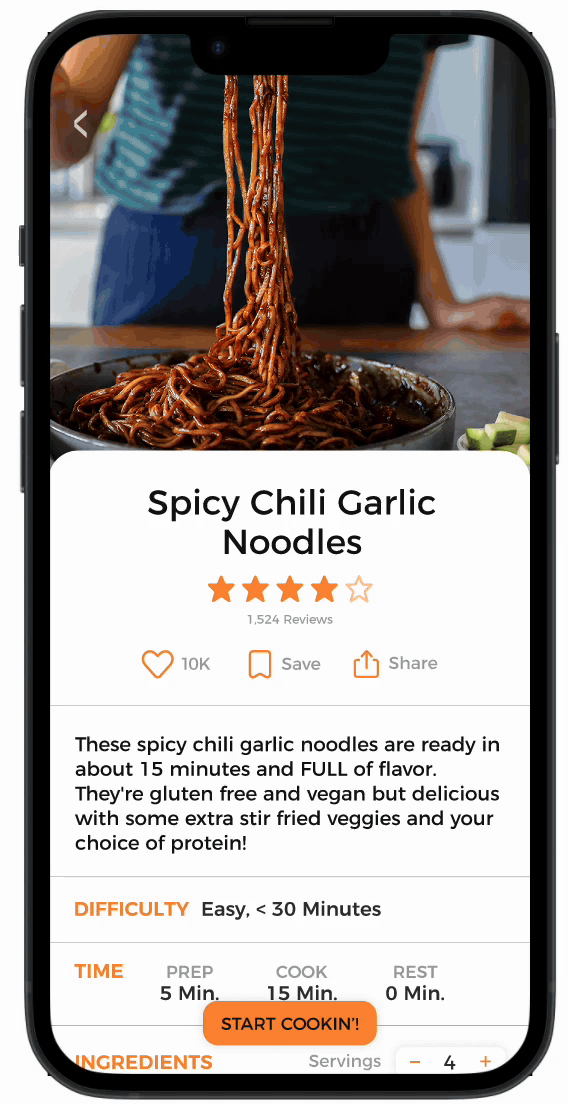 Once the user chooses a recipe, it will display how most recipes are provided - all the information on one long, scrollable screen. However, many interviewees said they struggled to refer back to their phone, especially with dirty/contaminated hands, having to scroll back and forth to see previous steps and ingredients. I created a Cook Mode to help eliminate the need to touch the phone as often.
