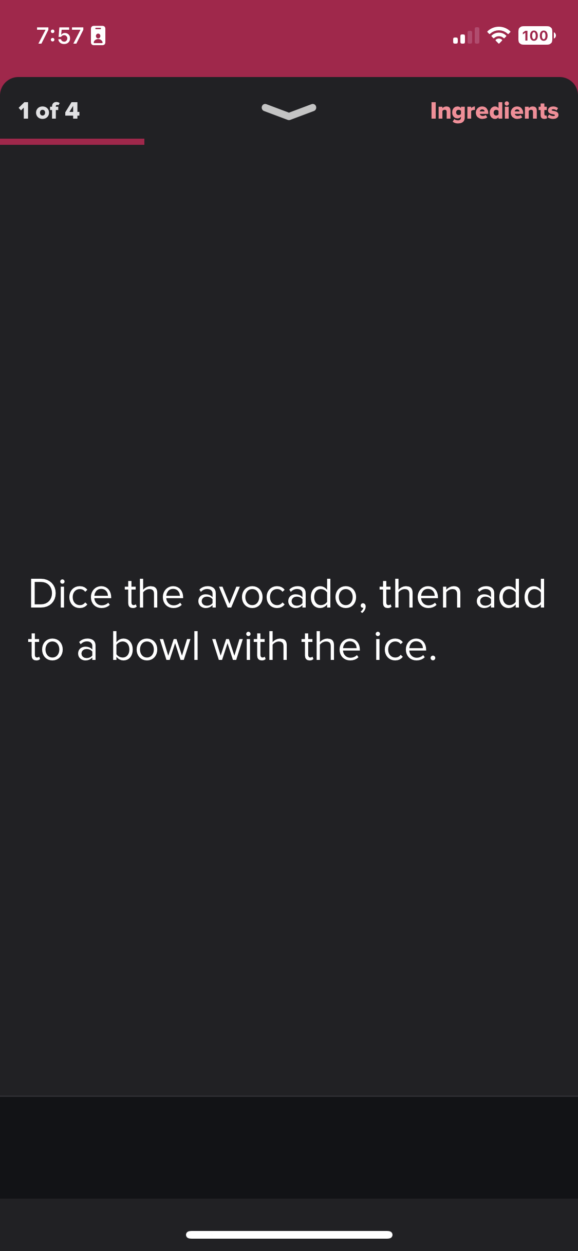 The Cook Mode functions like an Instagram story, tapping on the left to go back or on the right to move forward. I created it with large, scannable text so users could see it clearly. Nick also mentioned that he sometimes does not know if he is on the right track halfway through so providing images of what each step looks like was important to add to the design.