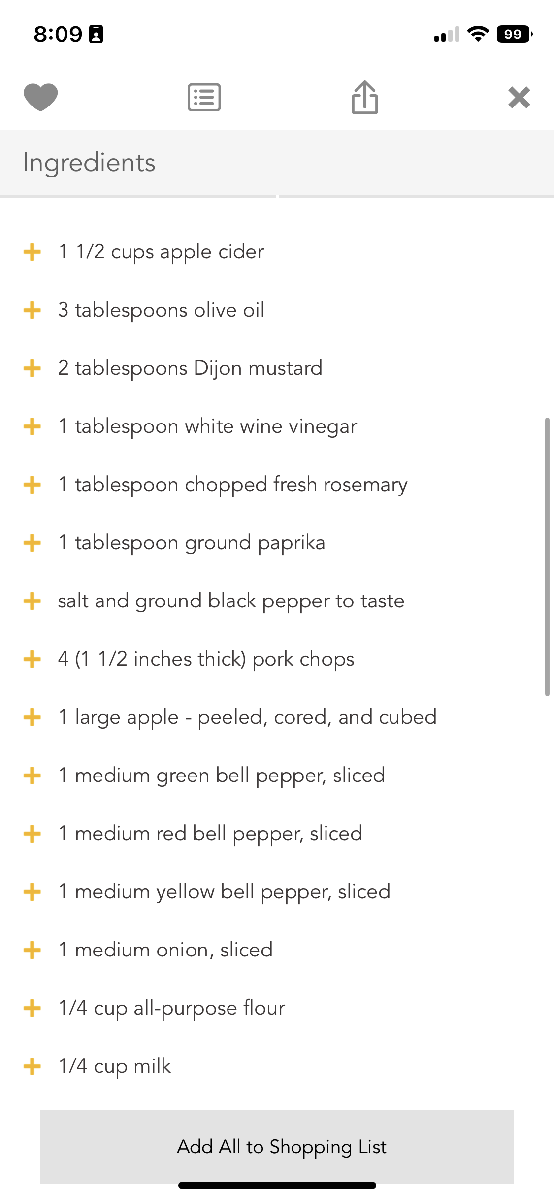 One click will add the whole recipe to your grocery list, where you can then adjust how many servings and check off what you have.